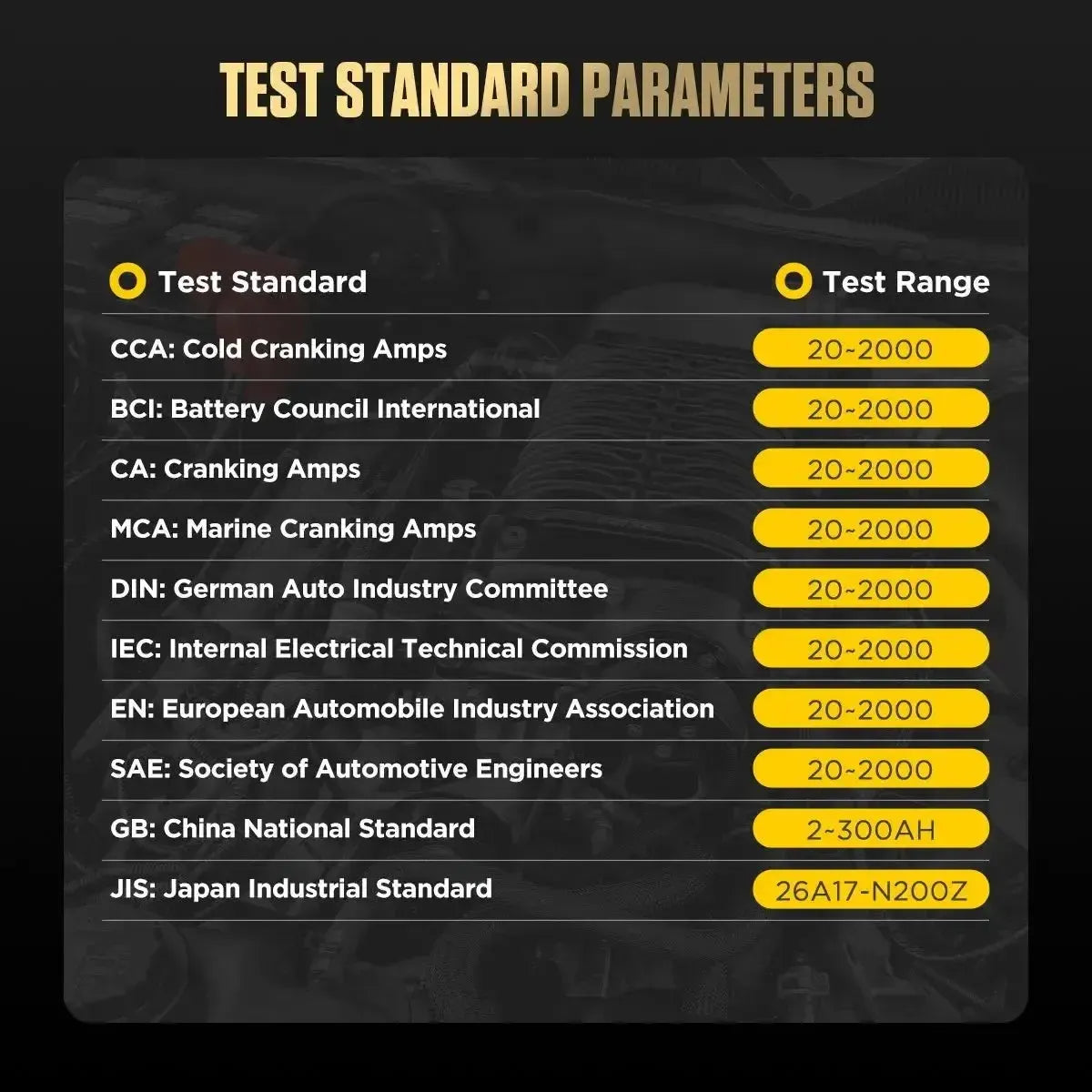 - Ergebnisanzeige: Die Messdaten werden direkt auf dem LCD-Bildschirm angezeigt, was eine schnelle Bewertung der Batterie und des elektrischen Systems ermöglicht.