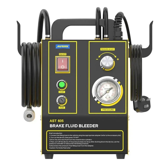 Der AST605 ermöglicht die gleichzeitige Bedienung aller vier Bremssättel, wodurch der Wechselvorgang beschleunigt wird und von einer Person durchgeführt werden kann. Das System ist kompatibel mit DOT3, DOT4 und DOT5.1 Bremsflüssigkeiten. Eine eingebaute Sicherung schaltet die Pumpe automatisch ab, wenn der neue Bremsflüssigkeitsbehälter leer ist, um zu verhindern, dass Luft in das Bremssystem gelangt. Das Gerät wird mit einem Satz Adaptern für die Anwendung bei verschiedenen Fahrzeugmarken geliefert.