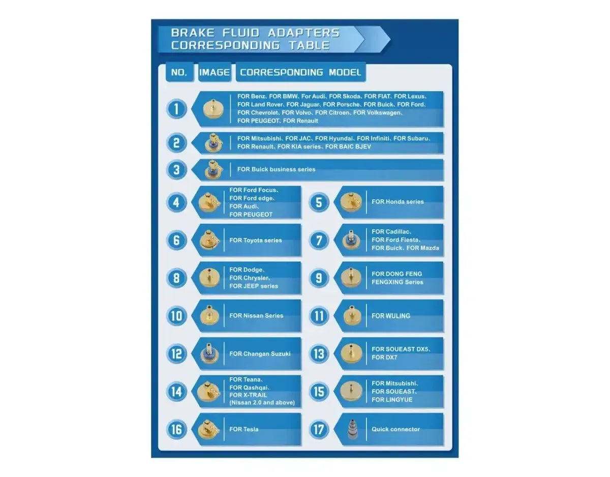Das Set enthält 16 verschiedene Bremsflüssigkeitsadapter sowie eine Schnellkupplung, wodurch es für verschiedene Automodelle geeignet ist. Alle Adapter werden in einem praktischen Aufbewahrungskoffer geliefert, sodass das Set leicht mitzunehmen ist.