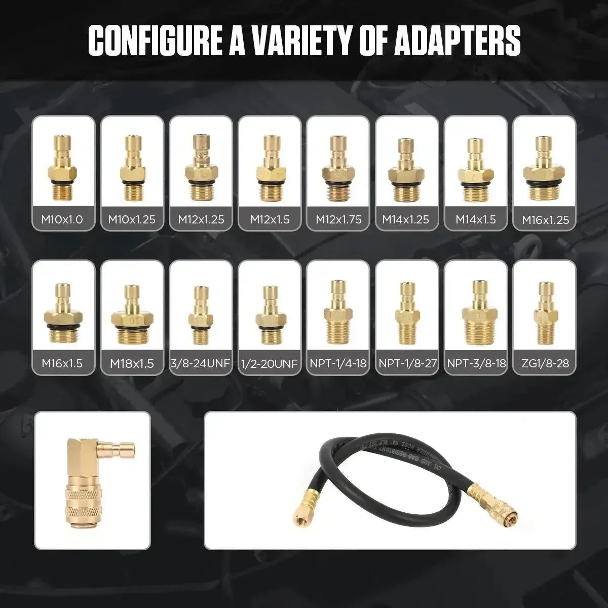| Anschlüsse | 16 Adapter (M10, M12, M14, M16, M18, UNF, NPT, ZG) und Winkel-Schnellkupplung |