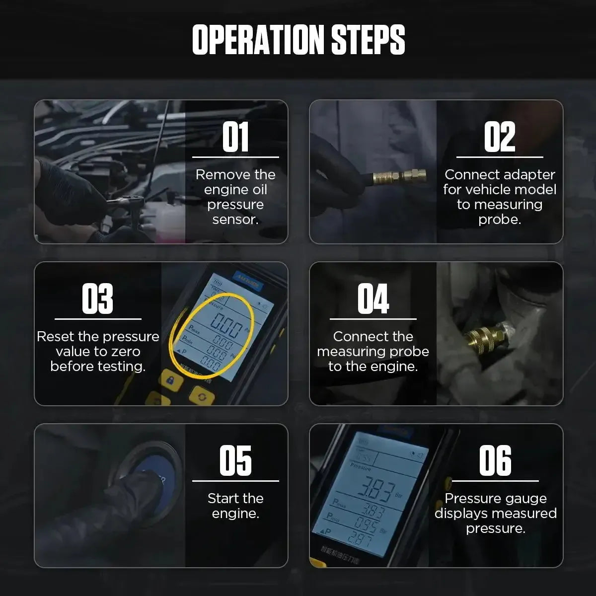 - Anwendung: Geeignet zur Diagnose von Problemen wie niedrigem Öldruck, zur Überprüfung der Funktion der Ölpumpe und zur Verifizierung der Genauigkeit von Öldrucksensoren.