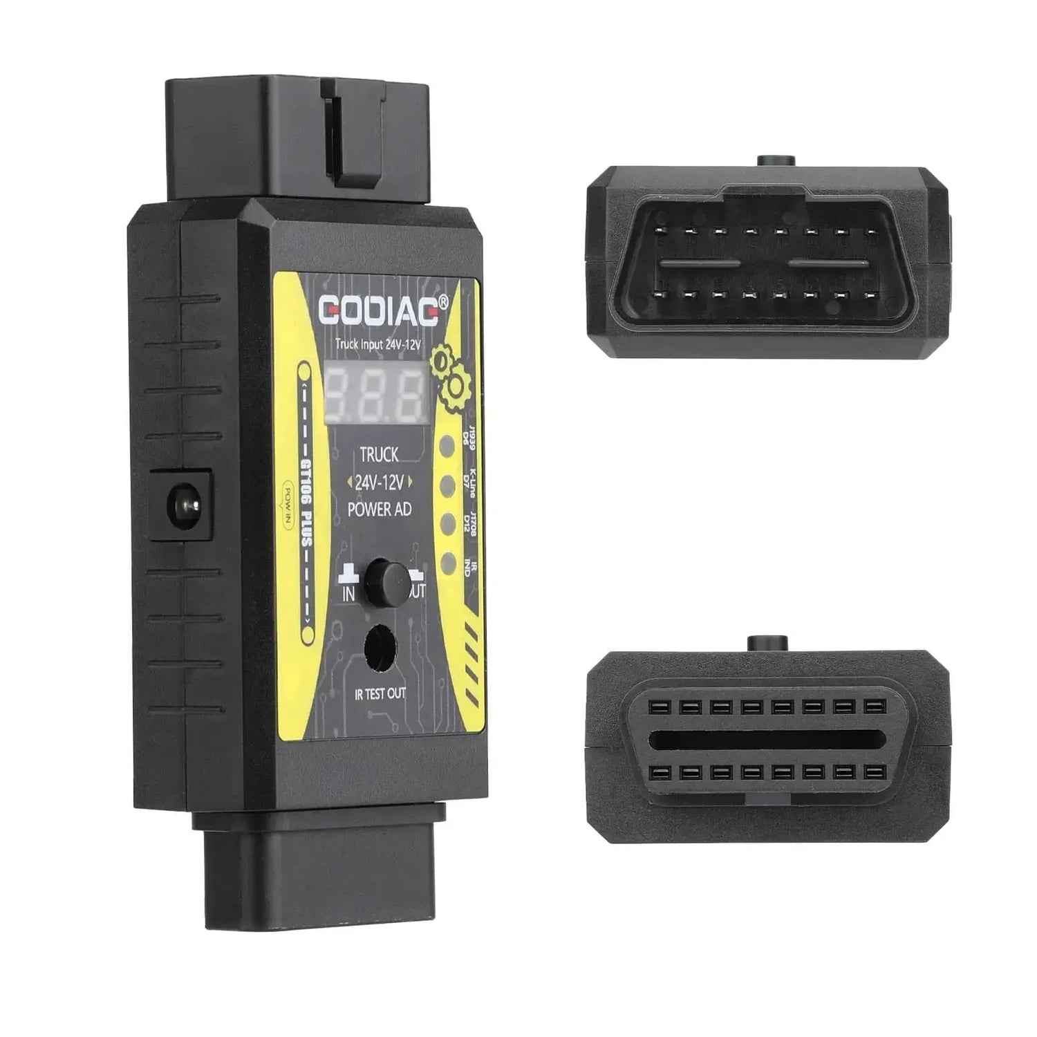 Der GoDiag GT106 Plus ist ein Spannungswandler, der speziell entwickelt wurde, um die 24V-Versorgung von schweren Nutzfahrzeugen in eine stabile 12V-Ausgangsspannung umzuwandeln. Dadurch ist es möglich, 12V-Diagnosegeräte an die OBD2-Buchse von LKWs anzuschließen. Das Modul ist mit einem digitalen Display ausgestattet, das die aktuelle Spannung anzeigt, sowie mit Protokollanzeigen für den Kommunikationsstatus.