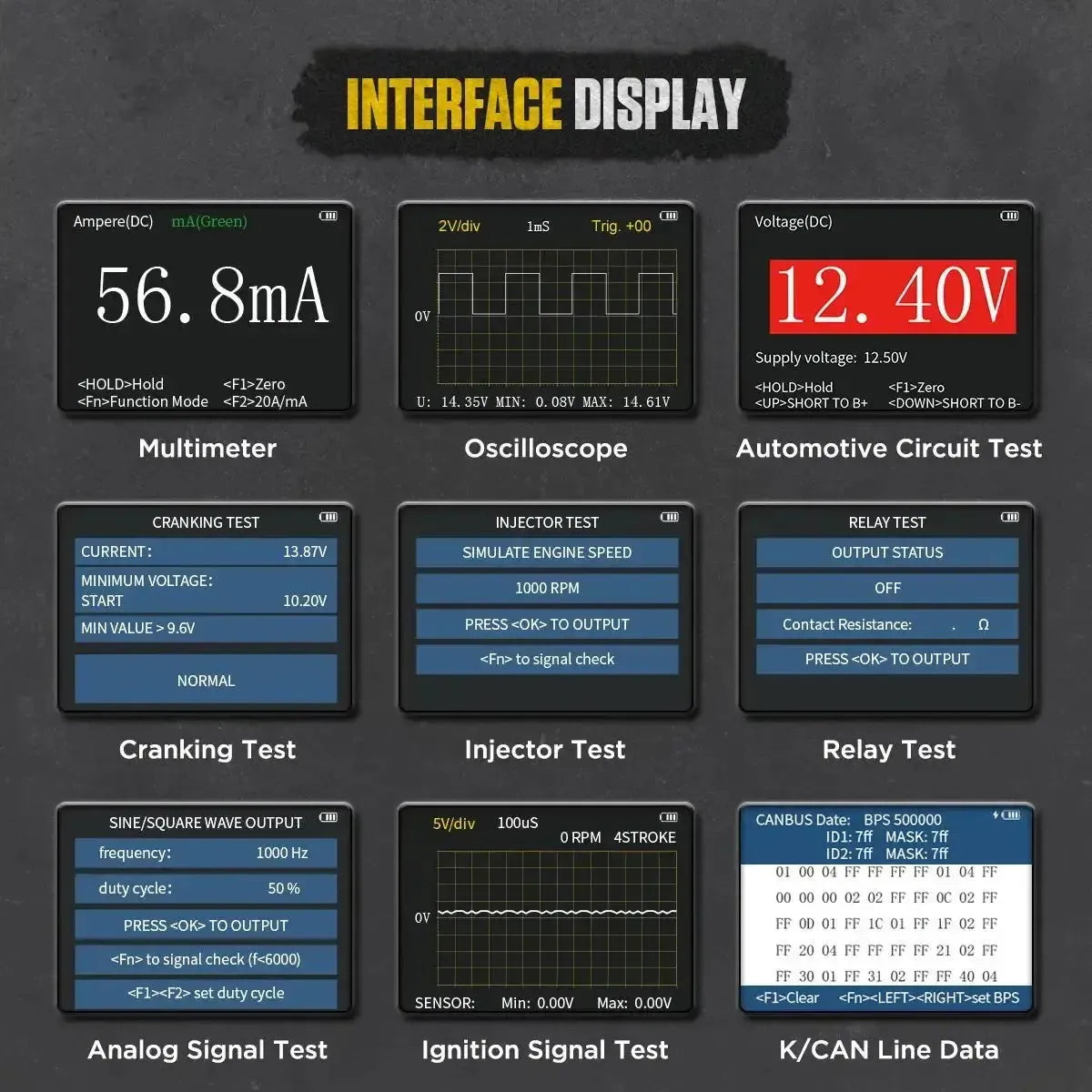 Neben Standardmessungen wie Spannung, Strom und Widerstand verfügt dieses Instrument über spezialisierte Automotive-Testfunktionen. Das integrierte Oszilloskop hat eine Bandbreite von 500 kHz zur Analyse von Sensorsignalen. Der Signalgenerator kann Sinus- und Rechteckwellen erzeugen, um ECU-Signale zu simulieren. Spezielle Testmodi für Einspritzventile, Relais, das Zündsystem, den Startkreis und K/CAN-Bus-Datenanalyse ermöglichen gezielte Diagnosen.