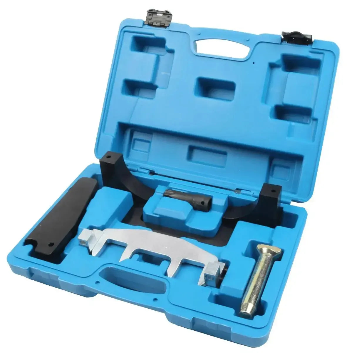 Der Lieferumfang des Sets umfasst eine Nockenwellenblockierung, eine Halterung zur Fixierung der Steuerkette, einen Sicherungsstift für den Kettenspanner und eine spezielle T100 Torx-Nuss. Die Werkzeuge sind darauf ausgelegt, die Motorsteuerung während Reparaturen korrekt einzustellen und zu erhalten. Das Set wird in einem Kunststoff-Aufbewahrungskoffer geliefert.