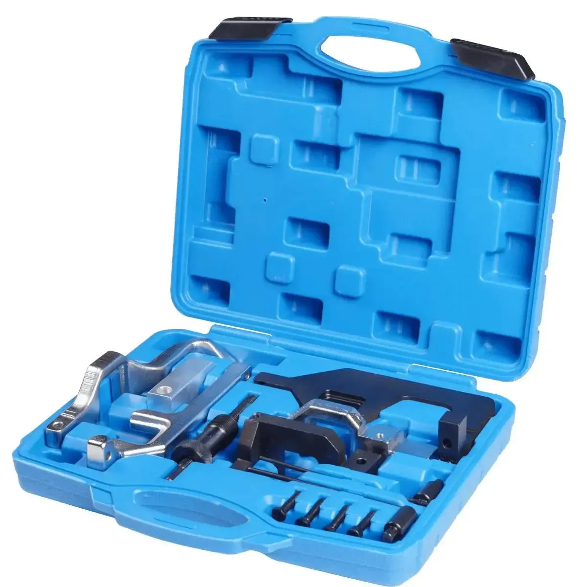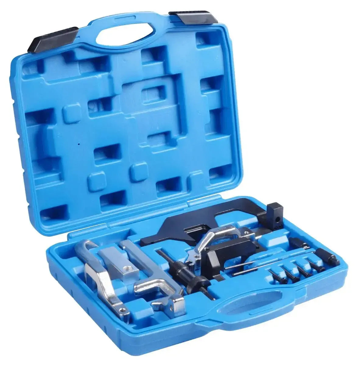 Das Set enthält spezielle Werkzeuge zum Arretieren der Nockenwellen und der Kurbelwelle in ihrer Oberen Totpunkt (OT)-Position, was eine korrekte Steuerzeit gewährleistet. Zusätzlich wird ein Kettenspanner-Werkzeug mitgeliefert, um die richtige Spannung der Steuerkette während der Montage aufrechtzuerhalten. Die Teile werden in einem Kunststoffkoffer zur Aufbewahrung und zum Transport geliefert.