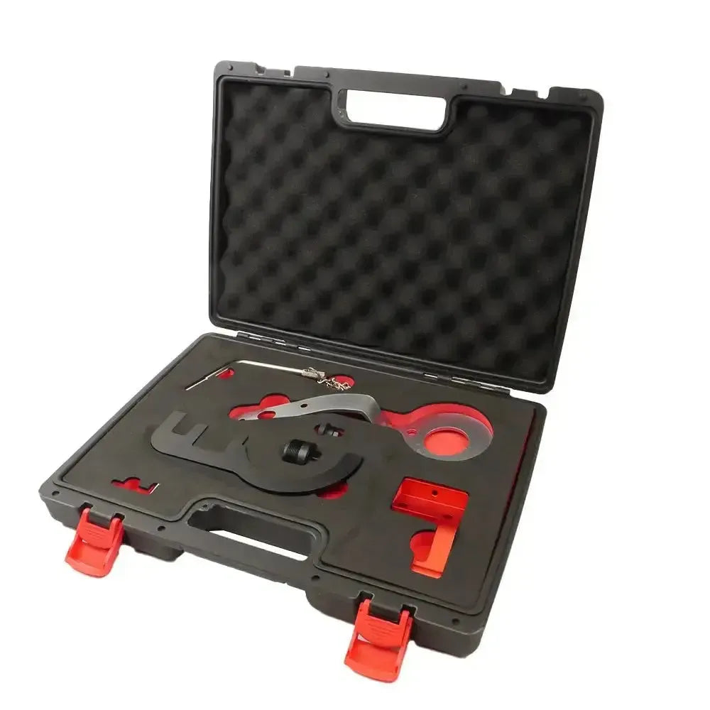 Dieses 7-teilige Set enthält Komponenten wie ein Nockenwellen-Arretierwerkzeug, verschiedene Werkzeuge zum Fixieren der Kurbelwelle und einen Abzieher für das Zahnrad der Hochdruckpumpe. Die Bauteile sind dafür ausgelegt, den Motor am oberen Totpunkt (OT) zu fixieren, was für den korrekten Austausch der Steuerkette und das Einstellen der Motorsteuerung erforderlich ist.