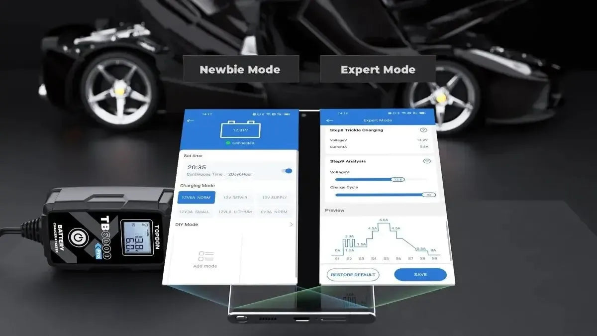 Neben den Standardladefunktionen bietet der TB6000Pro spezialisierte Modi für verschiedene Anwendungen. Der Reparaturmodus wurde entwickelt, um sulfatisierte oder geschichtete Batterien durch Pulsaufladung zu regenerieren. Der Versorgungsmodus liefert eine stabile 12V-Spannung, wodurch er als Stromquelle während des Batteriewechsels oder zur Versorgung von 12V-DC-Geräten fungieren kann. Über die zugehörige mobile App kann der Benutzer den Ladevorgang aus der Ferne überwachen und anpassen sowie detaillierte Ladeberichte erstellen. Das Ladegerät ist mit mehreren Schutzfunktionen ausgestattet, darunter Schutz gegen Funkenbildung, Verpolung, Kurzschluss, Überhitzung und Überspannung.