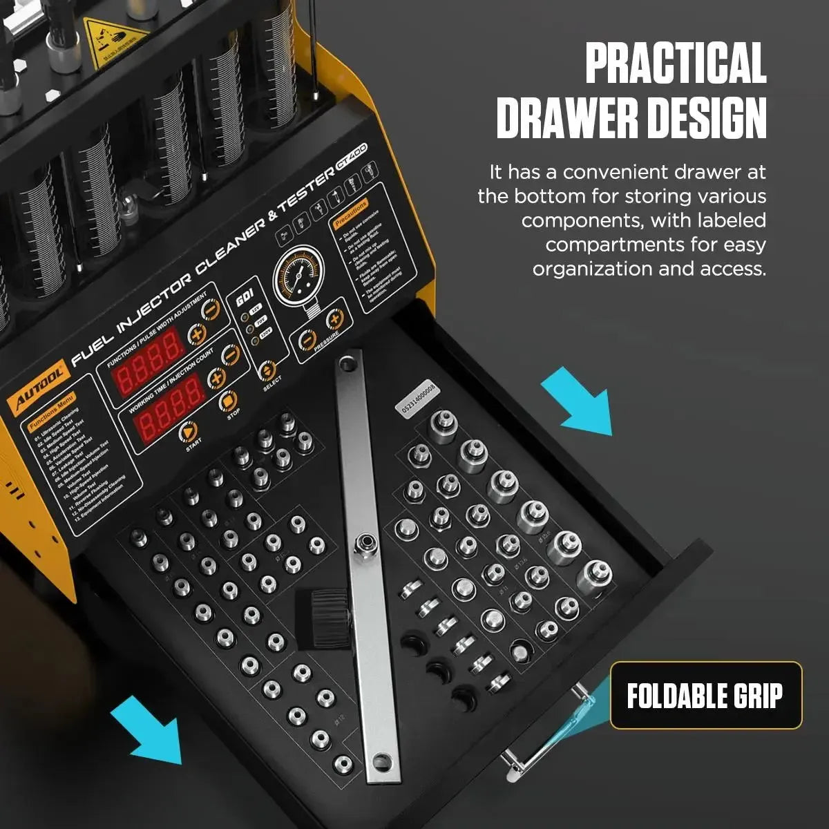 Die Funktionalität des CT400 wird durch ein fortschrittliches GDI-Steuerungssystem mit selektierbaren Testspannungen von 12V, 70V und 120V unterstützt, wodurch das Gerät für verschiedene GDI-Injektoren geeignet ist. Das Bedienfeld verfügt über digitale Anzeigen zur Einstellung von Parametern wie Drehzahl, Pulsbreite und Testdauer. Eine integrierte Schublade an der Unterseite bietet Stauraum für den Lieferumfang an Adaptern und Komponenten. Für die Sicherheit ist die Maschine mit einem intelligenten Temperaturkontrollsystem ausgestattet, das bei Überhitzung automatisch einen Kühlventilator aktiviert.