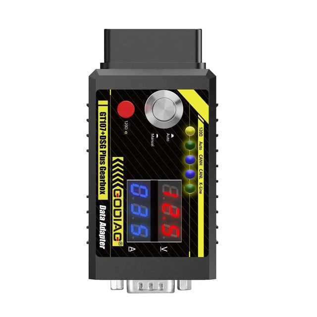 Der GoDiag GT107+ ist ein Daten-Adapter, der speziell für die Verbindung mit der ECU verschiedener DSG-Getriebe entwickelt wurde. Dieses Gerät ist kompatibel mit einer Reihe von Getriebe-ECUs, darunter die VAG-Serie (DQ200, DQ250, VL381, VL300, DQ500, DL501) und Modelle von Marken wie Benz und BMW. Der Adapter verfügt über ein integriertes digitales Display, das die aktuelle Spannung (V) und den Strom (A) der angeschlossenen ECU anzeigt, was bei der Überwachung des Status während der Arbeit hilft.
