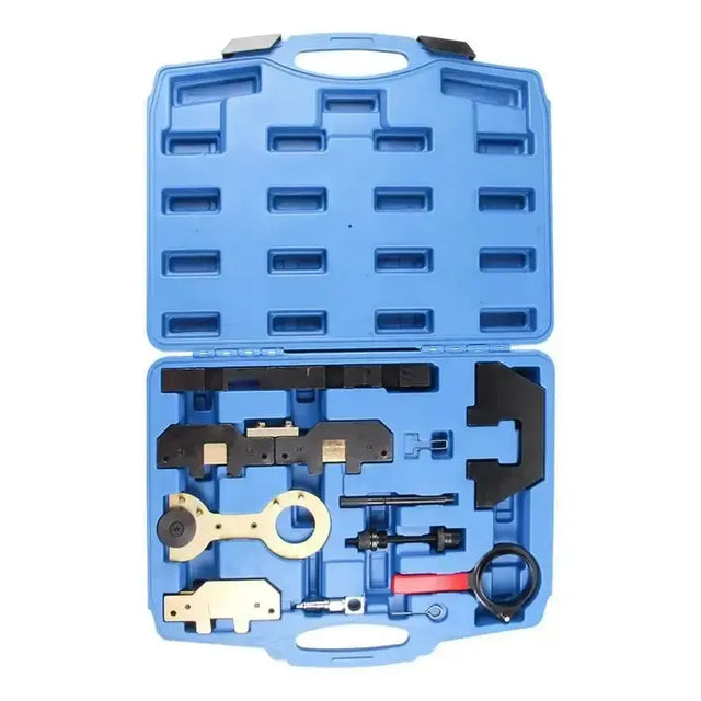 Dieses 11-teilige Set enthält alle benötigten Komponenten für Motoren mit sowohl einfacher VANOS (M50, M52) als auch doppelter VANOS (M52TU, M54, M56). Enthalten sind unter anderem verschiedene Nockenwellen-Ausrichtplatten, ein Kurbelwellen-Blockierstift, ein Werkzeug für den Kettingspanner und spezielle Werkzeuge zur Einstellung der VANOS-Einheit. Alle Teile werden in einem Kunststoff-Aufbewahrungskoffer geliefert.