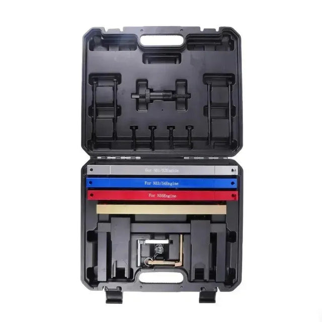 Das Set enthält spezifische Blockierwerkzeuge für die Nockenwelle, abgestimmt auf die verschiedenen Motorgenerationen, ein Ausrichtwerkzeug für die VANOS-Versteller und einen Kurbelwellenblockierstift. Zusätzlich werden ein Kettenspanner und Sicherungsstifte mitgeliefert, um die Steuerkette korrekt vorzuspannen. Das Ganze wird in einem Kunststoff-Aufbewahrungskoffer geliefert.